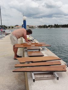 Firstly each piece of teak was cleaned with Teak Wonder Brightener to get an equal colour across the whole piece of wood – this was followed by sanding lightly. Each piece was then varnished on each side with four coats of Epifanes PP Vernis Extra which is a two component product – each coat took around 3-4 hours to dry and of course we could only do one side at a time. After this, we applied four coats of Epifanes Rapid Clear – Semi-Glosss – which also took around 4 hours for each coat to dry. As you can imagine, this was a pretty long process with all the individual pieces of wood and the numerous coats – so the harbour wall was decorated with our wood panels for quite a long time!