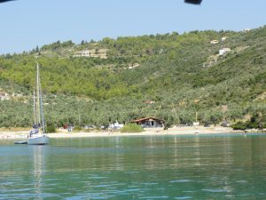 Ormos Tzortzi ended up not being as bad as I thought it would be – fortunately the swell rolling in was from passing boats so it did die down in the evening and we ended with a calm night. When we woke in the morning it was very pleasant – it was almost a shame to leave but we need to make tracks to get to Thessaloniki on time – although the weather forecast looked completely clear for the next week when we looked yesterday, there are now some windier conditions coming in the day after tomorrow so we don’t want to end up getting stuck or having to sail in bad weather!