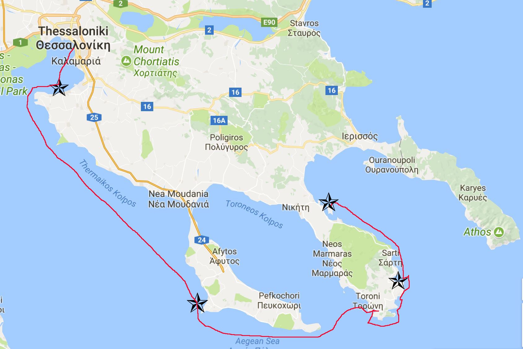 We woke quite early in Kassandra Point, which was hardly surprising given we were right out in the open, in front of a beach.  The Mantus had held perfectly – although there wasn’t really much wind to give it a real test.  We retrieved the anchor and left the bay around 10h45 intending to get to Porto Koufos on the next peninsula for the night.  There was nothing much to report with the journey – we traced our track backwards and had therefore seen it all the last time.  The wind was calm to start with and we were motoring – I had my laptop out in the cockpit and was happily catching up with some work.  Just before we …….